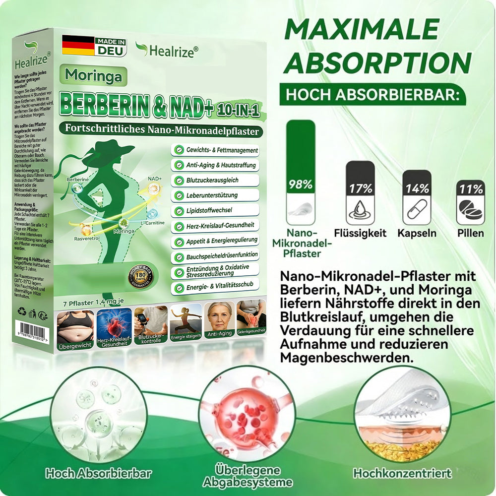 Offizieller Shop | 🩹🔬 GLORDENDA® Moringa Berberinex NAD+ 10-in-1 Nano-Mikronadel-Patch (Nur einmal täglich, sichtbare Veränderungen in 7 Tagen) ✅ Für Übergewicht, lockere Haut, Diabetes, Schlafapnoe, Gelenkprobleme und mehr